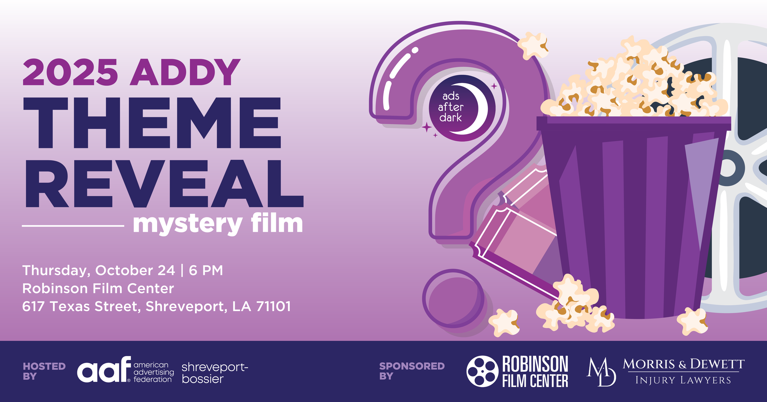 Join the American Advertising Federation of Shreveport-Bossier (AAFSB) for their 2025 ADDY Theme Reveal on Thursday, October 24th, from 6:00-8:30 PM! This exciting evening will feature a mystery film screening, culminating in a teaser trailer that unveils the upcoming 2025 American Advertising Awards theme. Network with fellow advertisers, marketers, and creatives while celebrating the spirit of innovation in advertising. Don’t miss this unique opportunity—get your tickets today!