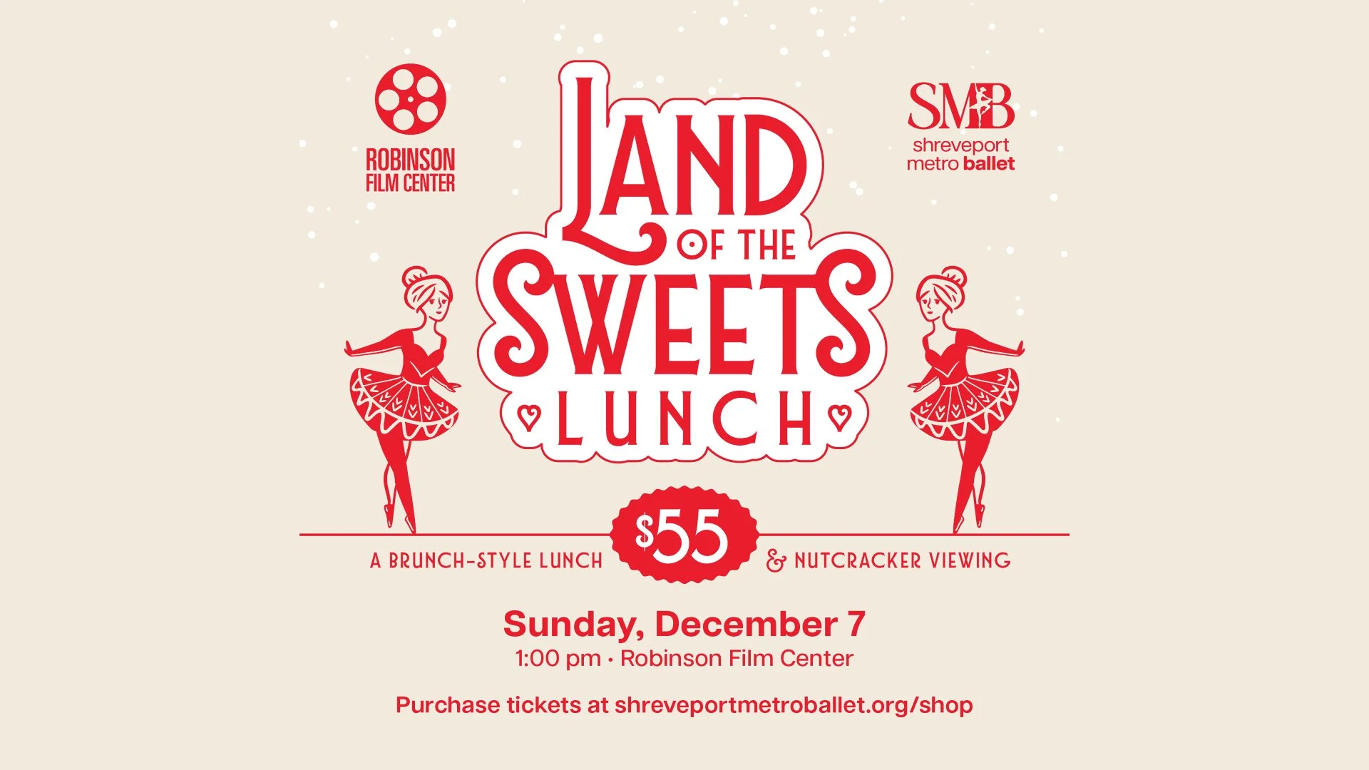 You’re invited to a magical holiday event! Join the Shreveport Metropolitan Ballet in the Land of the Sweets for a festive brunch-style lunch featuring a screening of beloved holiday classic The Nutcracker at Robinson Film Center on Sunday, December 7th. Bring the whole family and celebrate the season with sweet treats, cozy flavors, and a touch of holiday magic!