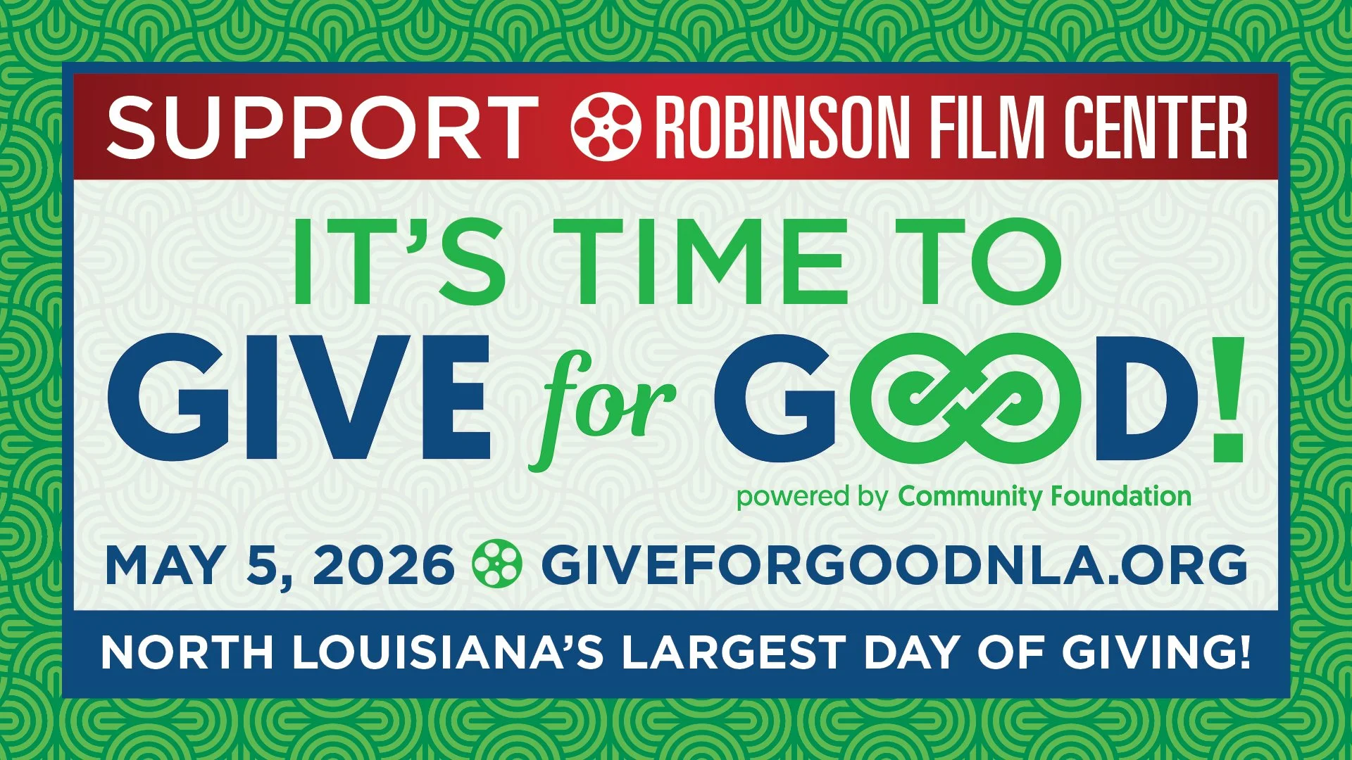 During Give For Good, everyone is a philanthropist! The online giving event is an interactive and exciting 24-hour online giving challenge led by Community Foundation of North Louisiana. This day of giving raises thousands of unrestricted dollars for North Louisiana organizations and brings community members together to celebrate nonprofits and the important work that they are doing. Please consider donating to Robinson Film Center during this year’s event. Every donation, big or small, will help us continue to bring North Louisiana the best programming and film education courses!